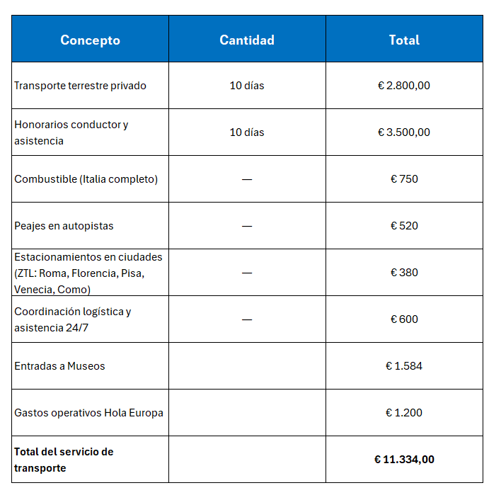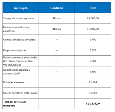 A continuación, presentamos el desglose correspondiente al servicio de transporte terrestre privado durante el viaje por Italia, con acompañamiento personalizado por parte del señor Raúl Daniel Medina Moncada, en representación de Hola Europa.